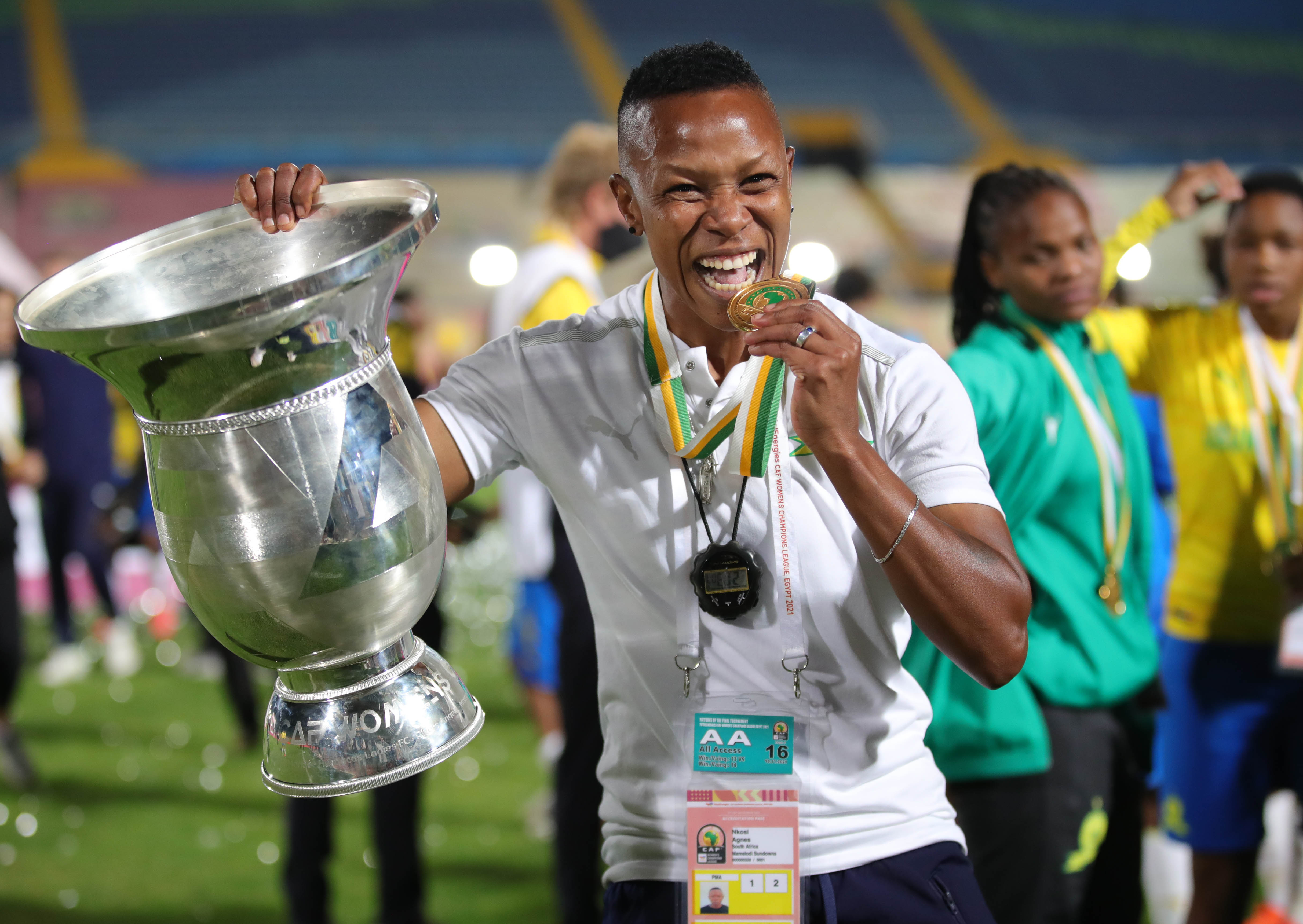 Agnes Thandiwe Nkosi, coach of Mamelodi Sundowns celebrates victory during the 2021 TotalEnergies CAF Women’s Champions League football Final between Hasaacas v Sundowns at 30 June Stadium, Cairo, Egypt on 19 November 2021 ©BackpagePix