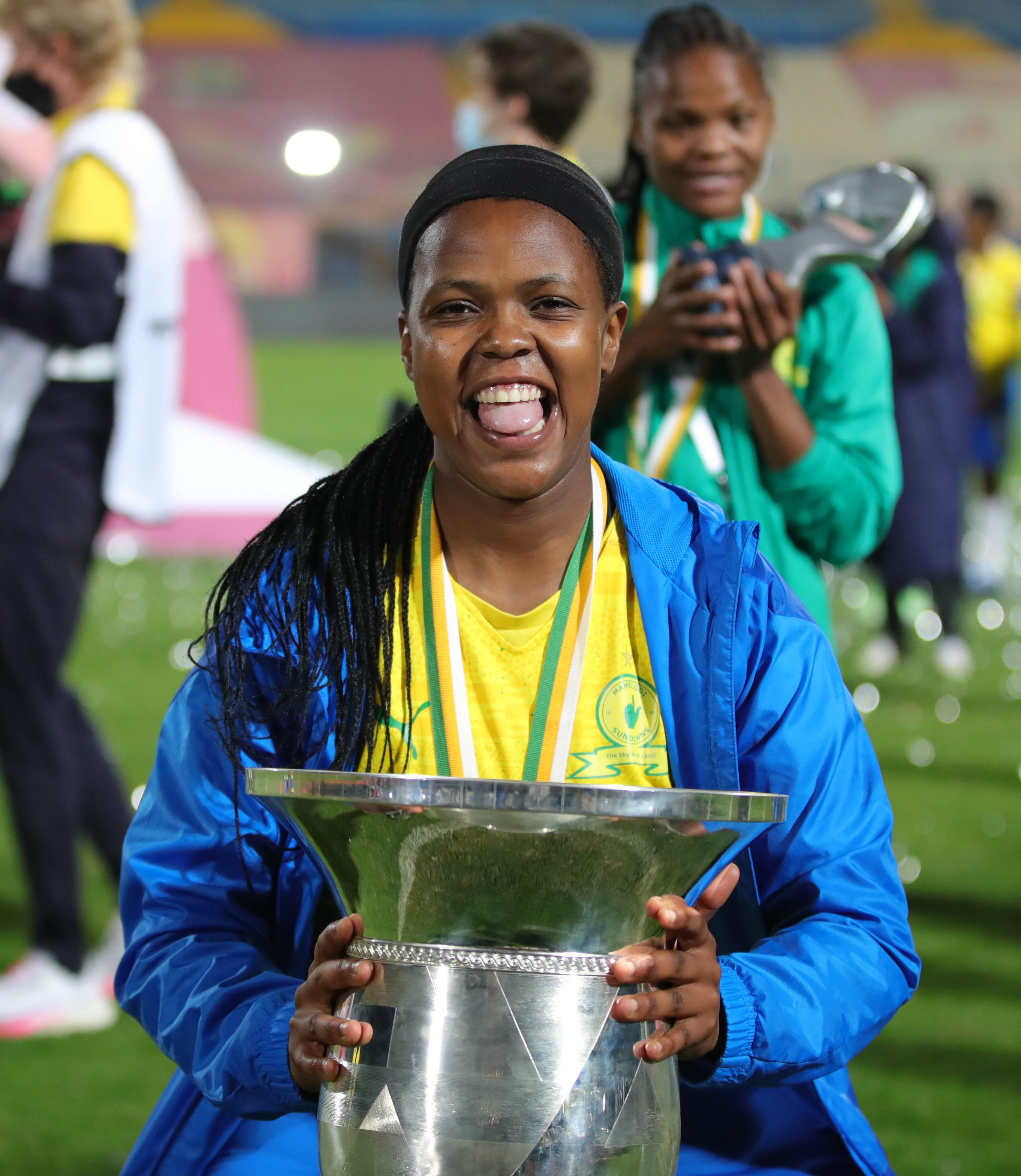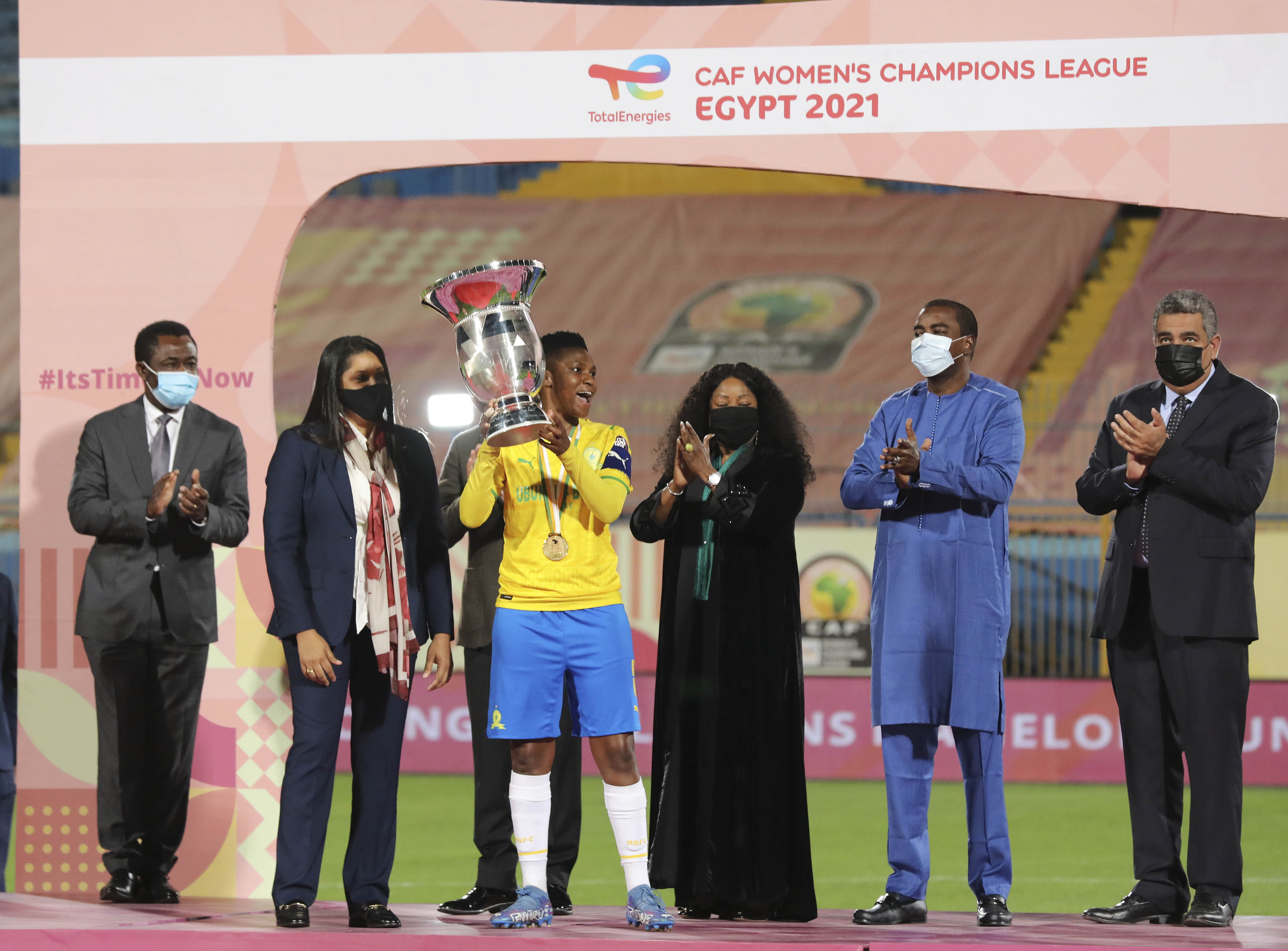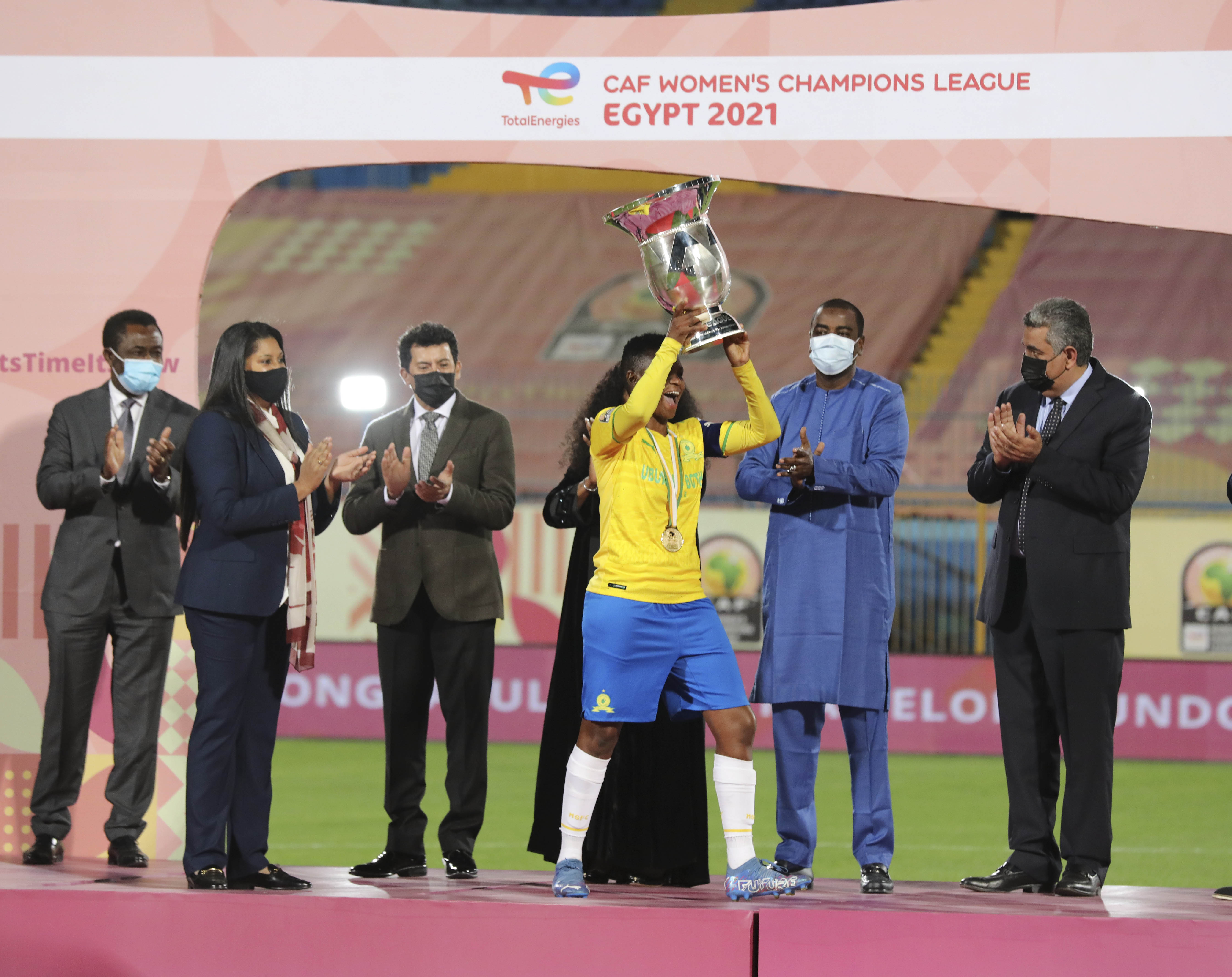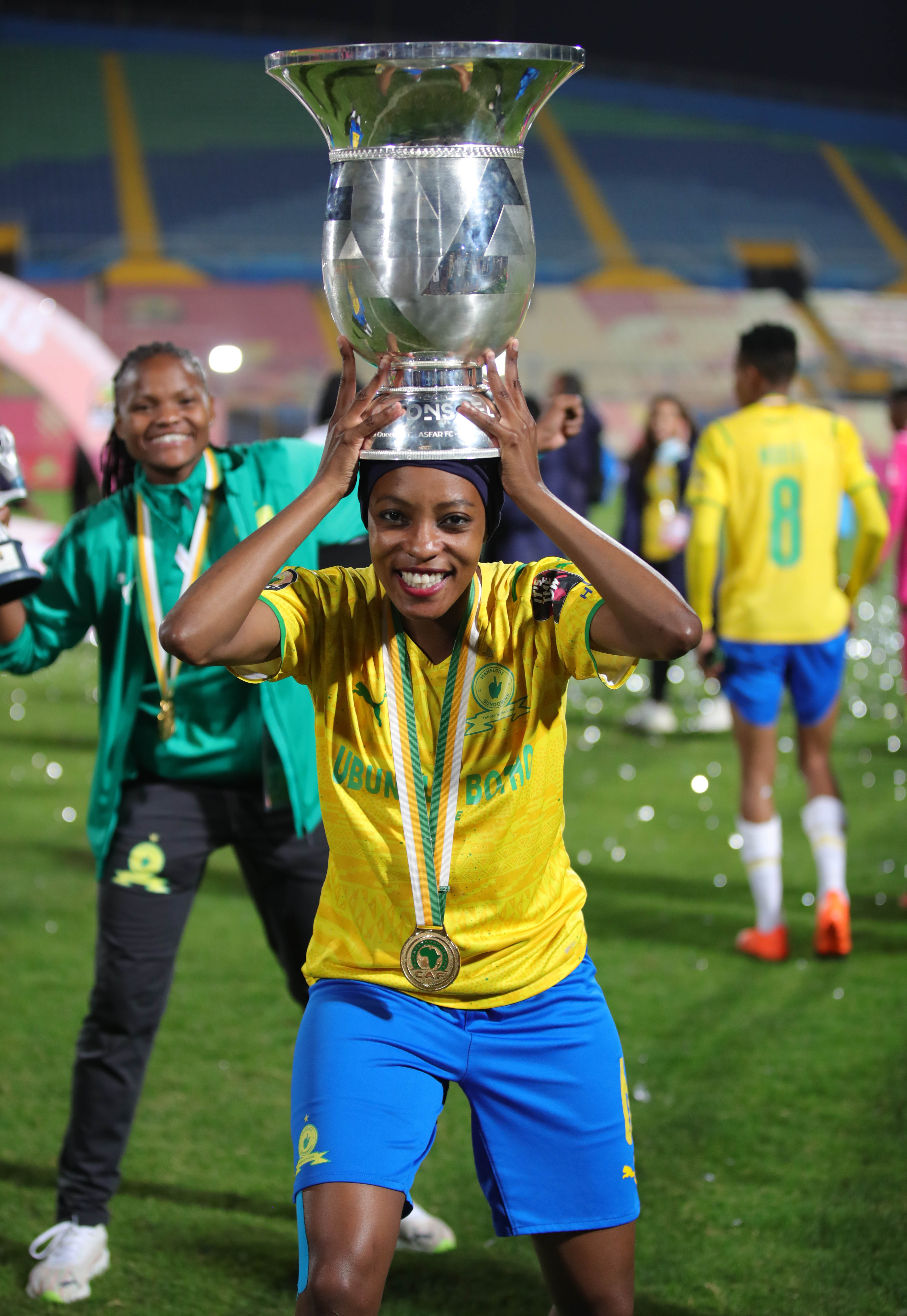 Zanele Portia Nhlapho of Mamelodi Sundowns holds aloft trophy during the 2021 TotalEnergies CAF Women’s Champions League football Final between Hasaacas v Sundowns at 30 June Stadium, Cairo, Egypt on 19 November 2021 ©BackpagePix