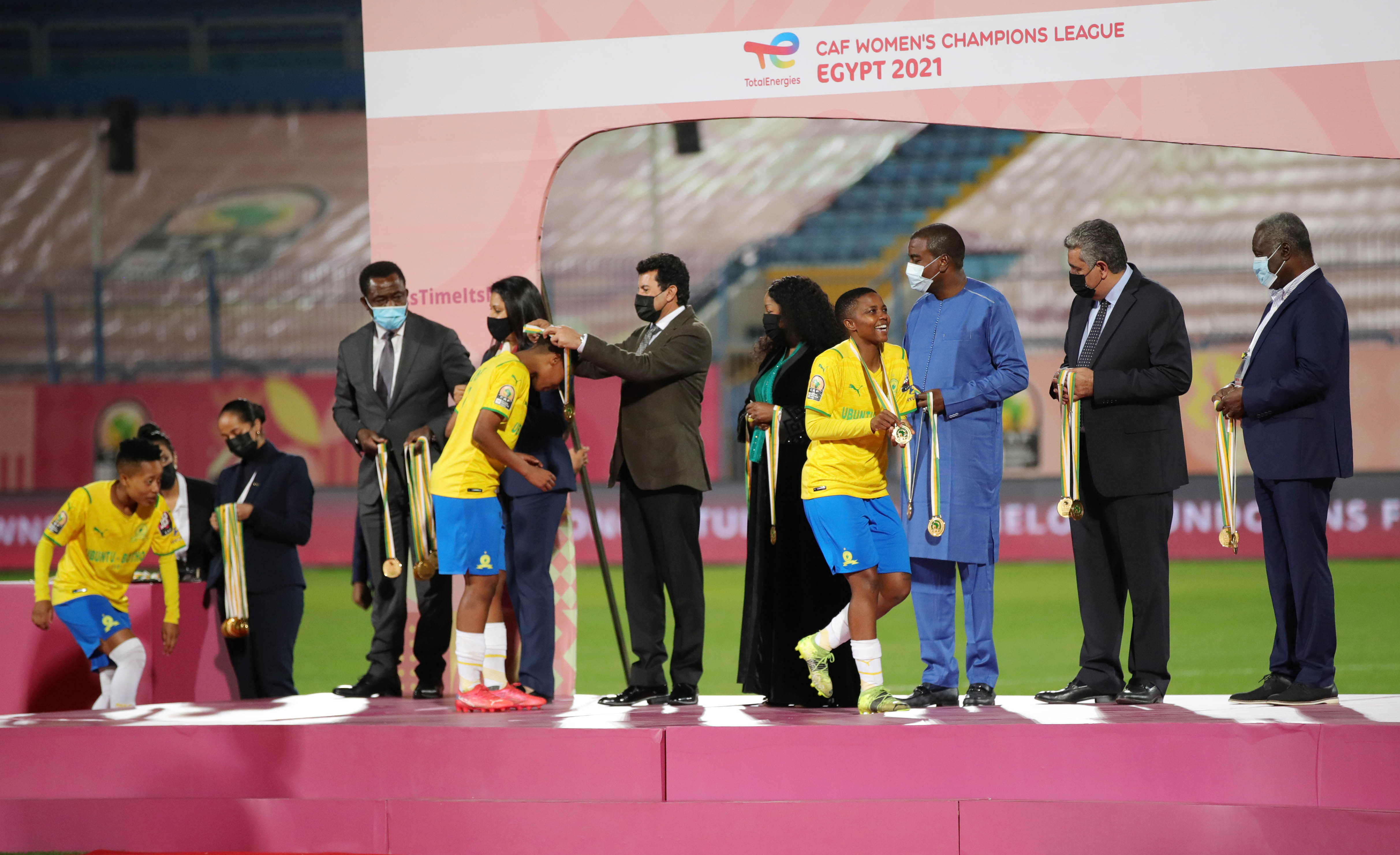 Mamelodi Sundowns players receive medals during the 2021 TotalEnergies CAF Women’s Champions league final match between Hasaacas Ladies and Mamelodi Sundowns at 30 June Stadium, Egypt, Cairo, on 19 November 2021 ©Samuel Shivambu/BackpagePix